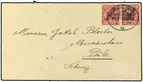 1899 Envelope to SWITZERLAND bearing German Cameroons 10 pf carmine (pair) (SG K3) tied by oval DEUTSCHE SEEPOST/HAMBURG WEST AFRIKA LINIE datestamp with BLE arrival on reverse. Attractive item.