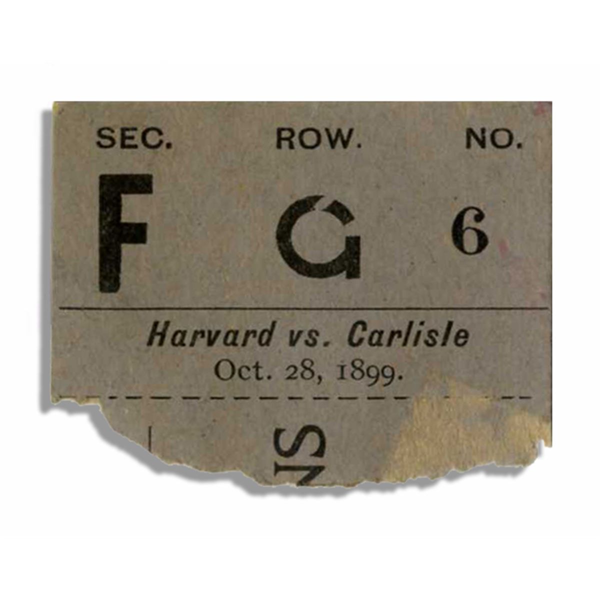 Original 1899 ticket stub from the 28 October 1899 football game between Harvard and Carlisle. 1899 was the first year of legendary football coach ''Pop'' Warner's reign at Carlisle and just a few years before exceptional athlete Jim Thorpe began playing for the Carlisle Indians. Ticket stub, measuring approximately 2'' x 1.25'', is in very good condition.