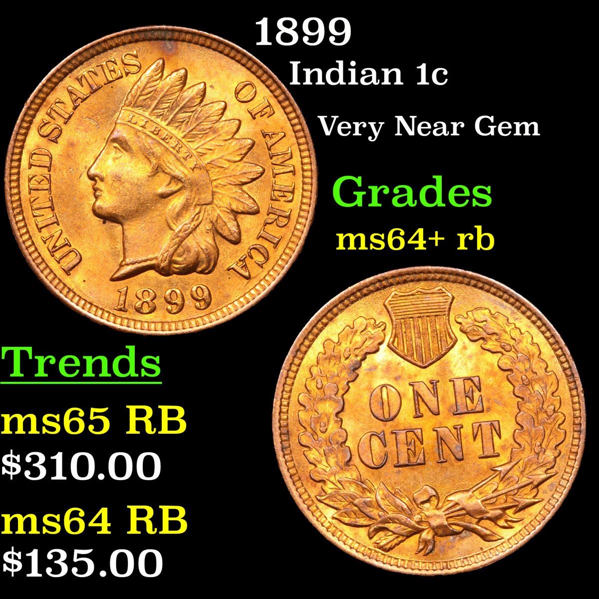 1899 . Very Near Gem Indian Cent 1c Grades Choice+ Unc RB.