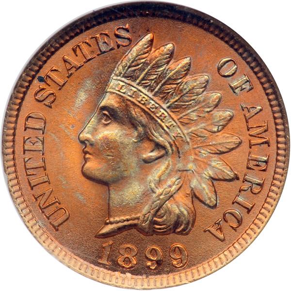 1899 Indian Head Cent. NGC graded MS-66 Red. A gorgeous gem Mint Red example, glowing with color, radiant in its detail. Pop 54; 9 in 67 RD, 1 in 68 RD.