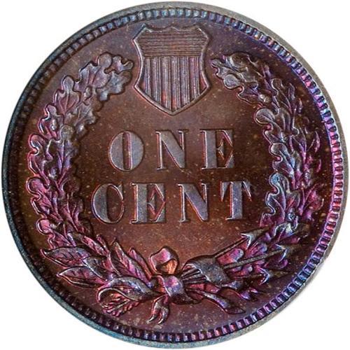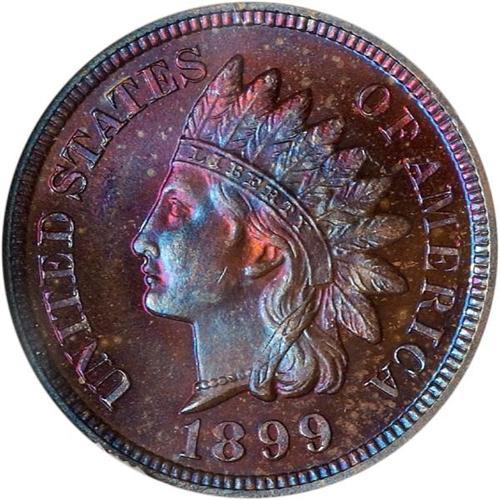 <b>1899 Indian Head Cent. NGC graded PF65 BR.</b> Deep autumnal shades of red, purple, and blue vie for dominance on this deeply colorful gem A frosted specimen with some bright iridescent highlights like this can be a real eye-opener as well as a discussion topic over a bottle of Chardonnay. Finally, we can report that this specimen, unlike some of the other Proofs this year, is outstanding in its detail and sharpness <b>(PCGS # 2384)</b>