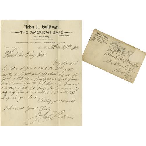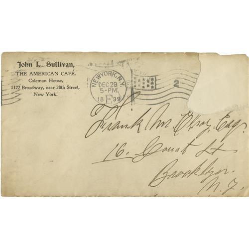 <B>1899 John L. Sullivan Handwritten Letter.</B></I> Straight from the battering ram that was this bare knuckle Champ's right hand comes this note to a creditor penned on Sullivan's restaurant letterhead. Taking on an apologetic tone, the Boston Strong Boy writes, "Dec. 29th, 1899. Frank McElroy, Esq., My dear sir, I will send you a check the 2nd of the month as I get paid off that day so be good until then. I appreciate past favors and I want you to feel that way. I am not one that forgets. If things had been running my way you never would have to waited as long as you have. Trusting you are well, believe me, Yours Truly, John L. Sullivan." Also included is the original mailing envelope, addressed entirely in Sullivan's hand and postmarked with the same date as the letter. Very, very slight separation at a few junctures of the original mailing folds are the only condition considerations, leaving the piece in splendid shape for display. <I>LOA from PSA/DNA.</B></I> <BR><BR><B>Important notice:</B> Heritage usually auctions material at the rate of 200-250 lots per hour. On some occasions eBay Live bid software or the Internet may not be able to keep up with the pace of the auction. We recommend placing a realistic absentee bid now as insurance to avoid disappointment. Occasionally the auctioneer may eliminate or reject an eBay Live bid, and the auctioneer may also reopen a lot after the close of the eBay live bidding (usually because we missed an audience bid), and may reject your bid even if it shows you as the winning bidder. By bidding via eBay Live, you agree that Heritage may award the lot to another bidder at its sole discretion under the circumstances described above or any other reasonable circumstances. Since eBay bids are not shown to us until we open the lot on the floor, we treat those bids just like floor bids. In most cases the floor responds before the eBay bid is presented to us, due to Internet lag time, so for consistency we have made it a policy that floor bids are always considered first over tie eBay live bids. Also please note that all Heritage lots purchased through eBay Live carry a 22.5% Buyer's Premium. Please make sure you read the Terms and Conditions before you bid. This lot is being auctioned in conjunction with a live floor auction by Heritage Galleries & Auctioneers. All final auction and invoice information will be supplied by Heritage Galleries & Auctioneers, and all other information should be considered preliminary. Lot:19135 <BR><BR><B>Winning Notification and Billing:</B> After the FINAL session in this auction is complete, Heritage will send e-mail and snail mail invoices. This process normally takes several days. All final auction and invoice information will be supplied by Heritage Galleries & Auctioneers, and all other information should be considered preliminary. <BR><BR>This auction will be conducted on a live auction floor and over the Internet through eBay Live. If you choose to place an absentee bid, please take a moment to <font color='#0000ff'><u><a href='http://pages.ebay.com/liveauctions/help/before/laabsentee.html'>learn how eBay Live absentee bidding works</a></u></font><font color='#000000'>