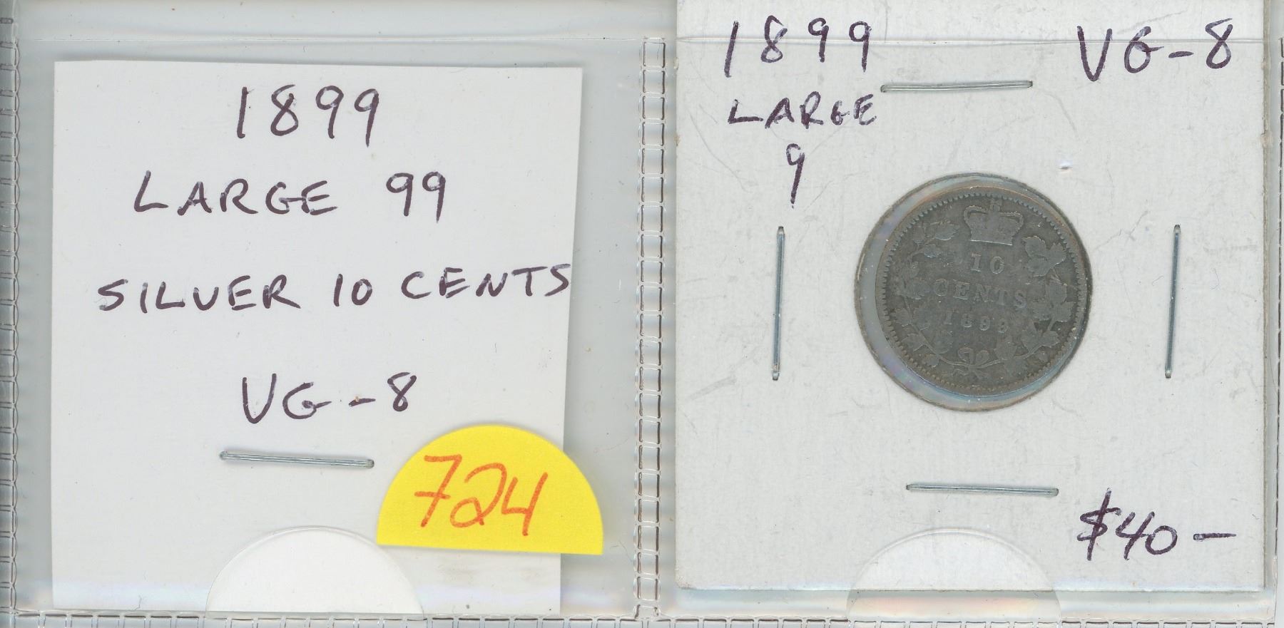 1899 Large 99 silver 10 cents VG-8. scarce.