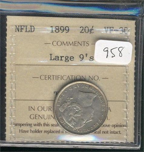 1899 Large 9's 20 cents ICCS VF30. A nice example.