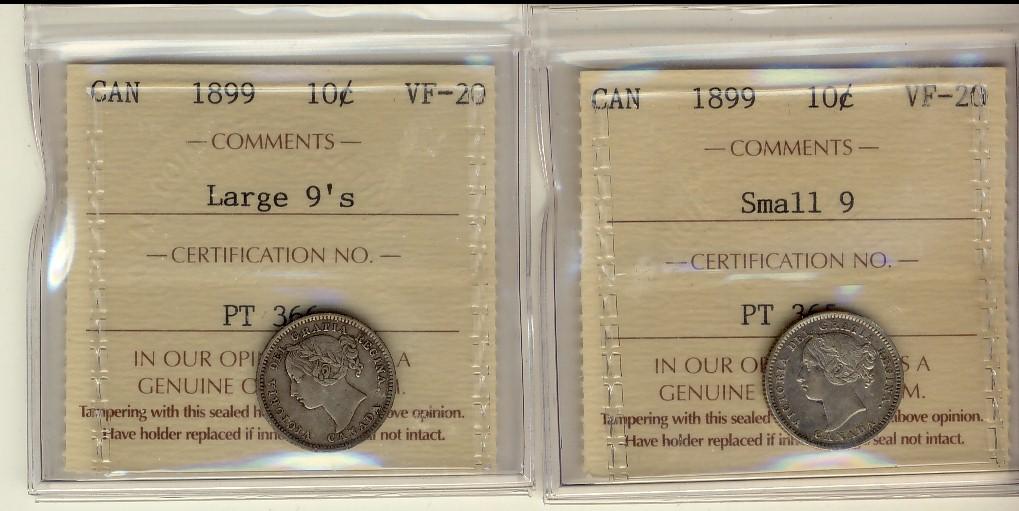 1899 Lg & Sml 9's 10¢ ICCS VF20. Lot of 2 coins