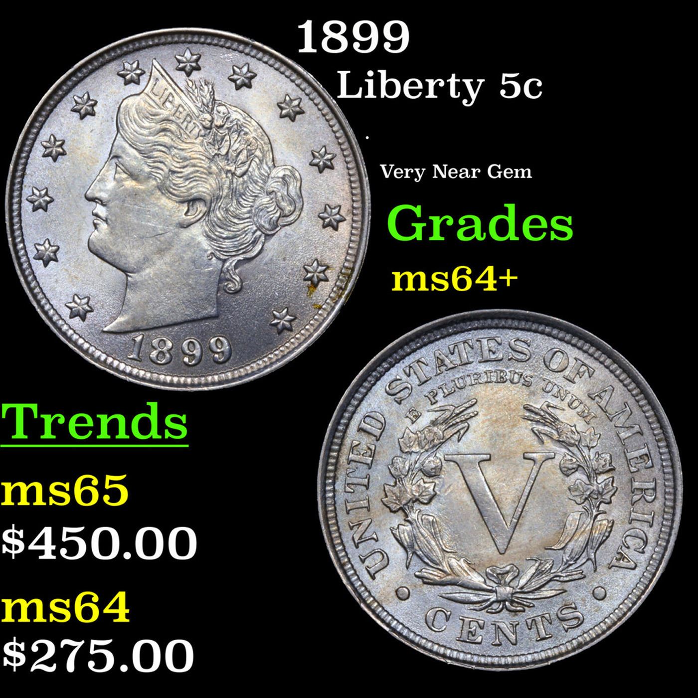 1899 Liberty Nickel 5c Grades Choice+ Unc.