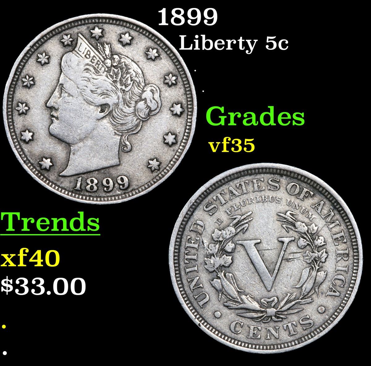 1899 . . Liberty Nickel 5c Grades vf++.