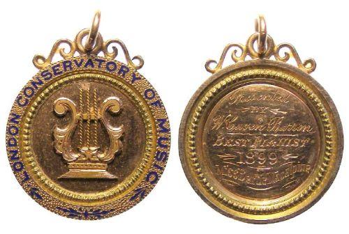 Canada, London Ontario, London Conservatory of Music round Gold medal, 1899. Obverse: Central disk of a music stand framed with gold, on which, in blue enamel says LONDON CONSERVATORY OF MUSIC (established 1892). Reverse: Hand engraved with PRESENTED BY W