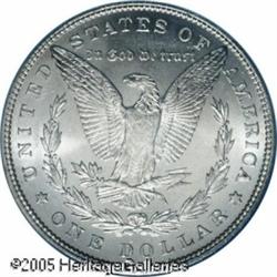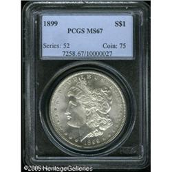 <B>1899<img border='0' src='http://www.heritagecoins.com/images/star.gif' width=10 height=10>$1 MS67 PCGS.</B></I> It has been claimed that the mintage of 330,000 pieces for the 1899 may be incorrect, and that many of this year's mintage were lumped in with those of 1900. This dispute may never be resolved, but what is not in doubt is the absolute rarity of this issue in Gem and better grades. This is a remarkably well preserved example that is brilliant throughout. The striking details are strong, and the surfaces are covered with the soft, frosted mint luster that is characteristic of silver coins struck in the Philadelphia Mint. Population: 16 in 67, 0 finer (1/05).<BR><I>From The Banks Collection.</B></I> Lot:10544