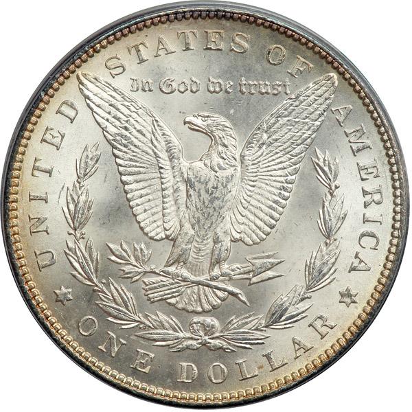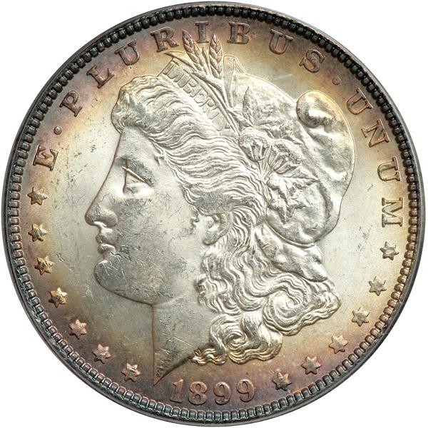 1899 Morgan Dollar. PCGS graded MS-64. Nicely toned around the edges. This P-mint date, a plaything of speculators in years gone by, has low mintage (330,846) plus ready availability in Mint State grades, a perfect combination for prices rises and falls (PCGS # 7258) .