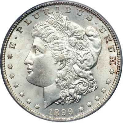 1899 Morgan Dollar. PCGS graded MS-65. Well struck with lovely semi-reflective surfaces. A first-class Gem. This is a popular low-mintage year (330,846 pieces). Inspect it like we did and we're sure you'll agree it is all that its grade says, and then some (PCGS # 7258).