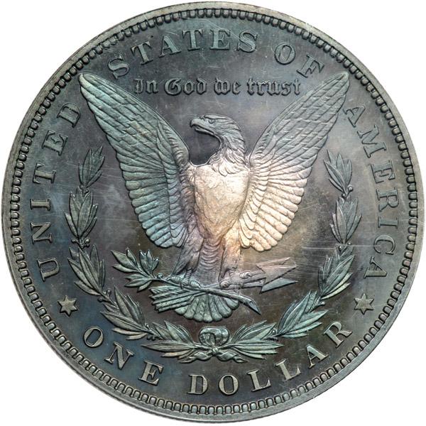1899 Morgan Dollar. PCGS graded Proof 67 PQ. An awesome Superb Gem Proof with tantalizing late evening colors blanketing both sides. Only 846 pieces struck. A Premium Quality example due to its eye appeal. Raised devices, which are needle-sharp in all areas, show their finer details due, in great measure, to the satiny surface imparted from the die. Pop 10; 1 finer in 68 (PCGS # 7334) .