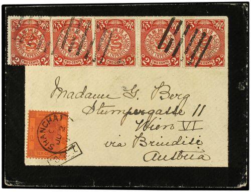 1899 Mourning envelope to Vienna fraked 2c.(5) ´Dragon´ tied barred cancel, together with QV 10c. cancelled Shanghai cds + boxed ´I.P.O.´ handstamp. Hong Kong transit on reverse.