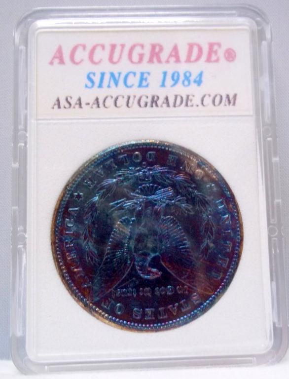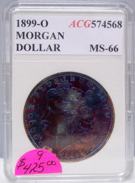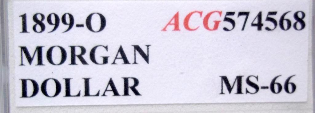 1899 New Orleans Mint Morgan Dollar ACCUGRADE Mint State-66. Another fantastic date coin from the ACCUGRADE hoard! This coin features tremendous rainbow toning on both obverse and reverse. A great addition to any high grade collection! This is a condition rarity coin with very few available is such a high grade.