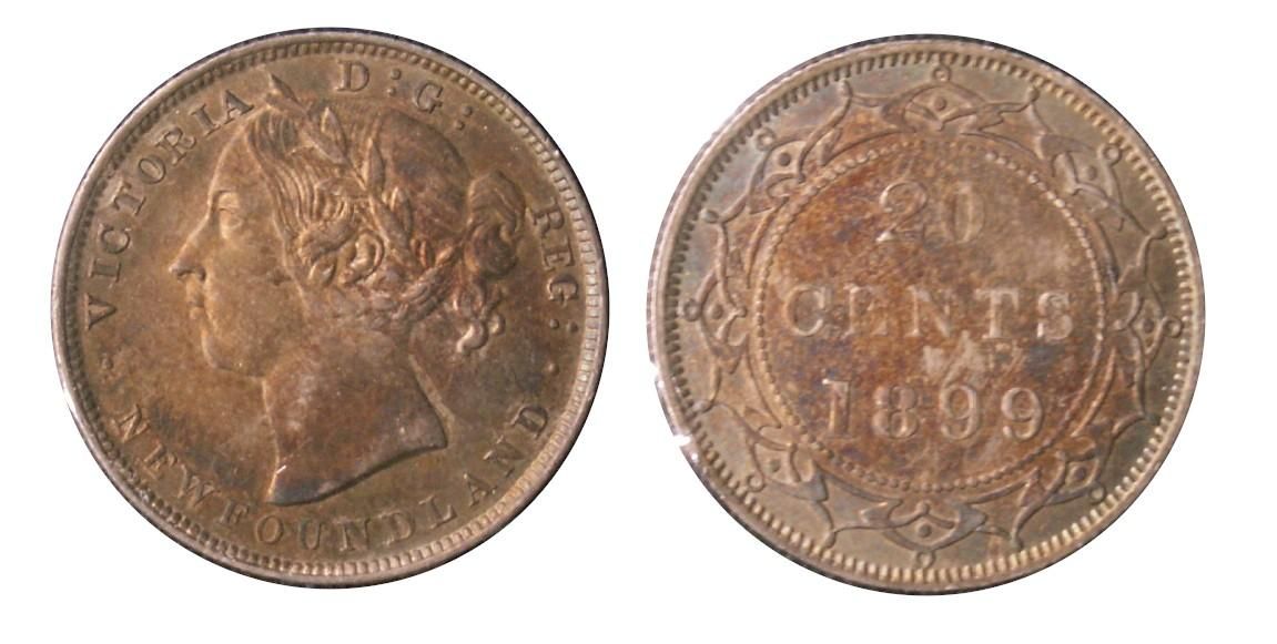 1899 Nfld 20¢ Large 9's EF40. Intensely toned with reddish to blue colours.