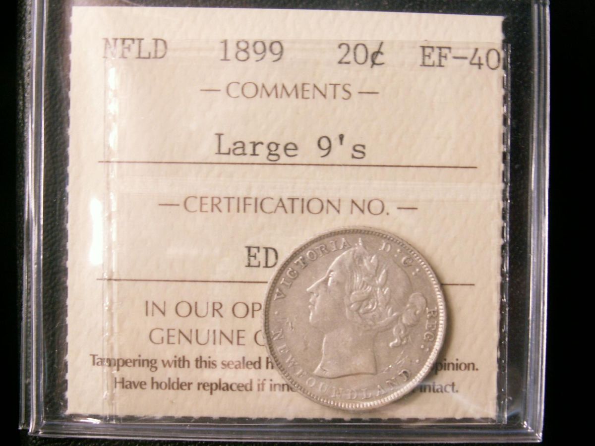 1899 Nfld 20¢ Large 9's ICCS EF40. Nice coin with subtle lustre.
