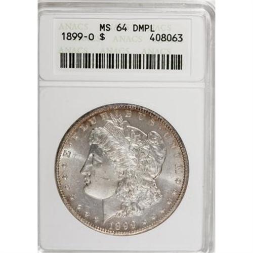 <B>1899-O $1 MS64 Deep Mirror Prooflike ANACS.</B></I> NGC Census: (52/31). PCGS Population (72/62). Numismedia Wsl. Price for NGC/PCGS coin in MS64: $320. (#97261)<BR><BR><b>Shipping:</b> Coins & Currency (<a target="_blank" href="http://www.heritageauctions.com/common/shipping.php">view shipping information</a>)