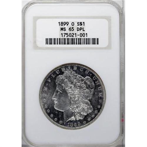 <B>1899-O $1 MS65 Deep Mirror Prooflike NGC.</B></I> . NGC Census: (22/9). PCGS Population (43/19). Numismedia Wsl. Price for NGC/PCGS coin in MS65: $1,150. (#97261)<BR><BR><b>Shipping:</b> Coins & Currency (<a target="_blank" href="http://www.heritageauctions.com/common/shipping.php">view shipping information</a>)