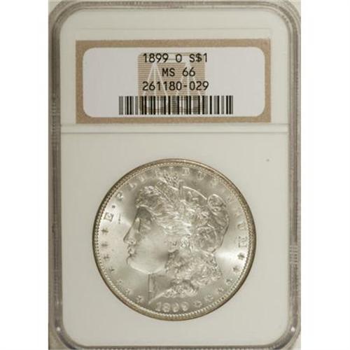 <B>1899-O $1 MS66 NGC.</B></I> NGC Census: (831/76). PCGS Population (989/78). Mintage: 12,290,000. Numismedia Wsl. Price for NGC/PCGS coin in MS66: $340. (#7260)<BR><BR><b>Shipping:</b> Coins & Currency (<a target="_blank" href="http://www.heritageauctions.com/common/shipping.php">view shipping information</a>)