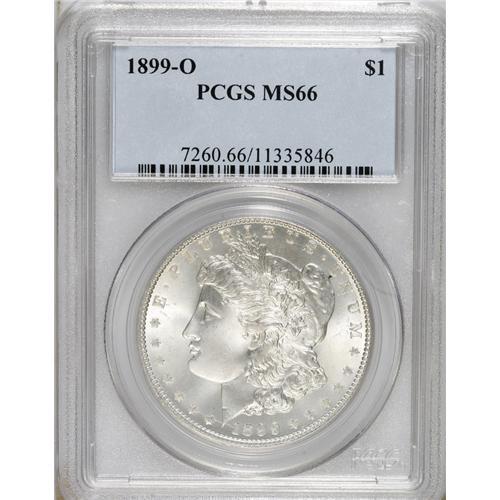 <B>1899-O $1 MS66 PCGS.</B></I> PCGS Population (980/77). NGC Census: (812/70). Mintage: 12,290,000. Numismedia Wsl. Price: $372. (#7260)<BR><BR><b>Shipping:</b> Coins & Currency (<a target="_blank" href="http://www.heritageauctions.com/common/shipping.php">view shipping information</a>)