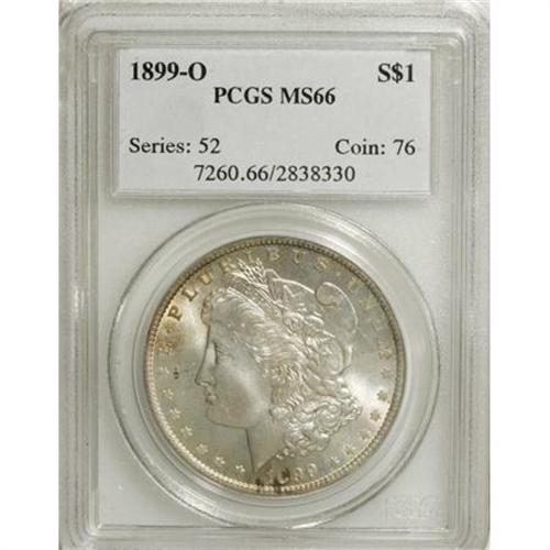 <B>1899-O $1 MS66 PCGS.</B></I> PCGS Population (989/78). NGC Census: (831/76). Mintage: 12,290,000. Numismedia Wsl. Price for NGC/PCGS coin in MS66: $340. (#7260)<BR><BR><b>Shipping:</b> Coins & Currency (<a target="_blank" href="http://www.heritageauctions.com/common/shipping.php">view shipping information</a>)