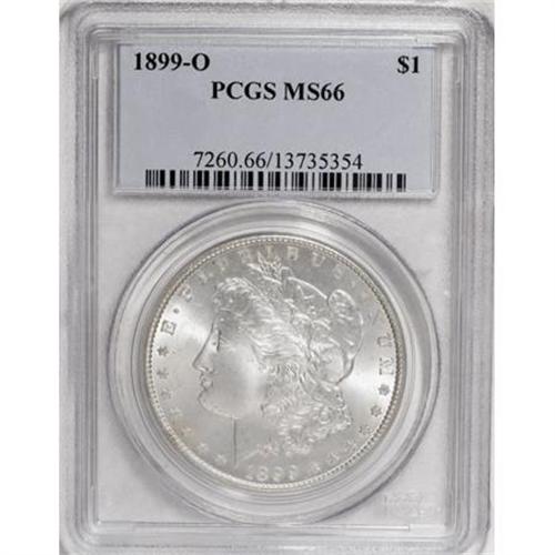 <B>1899-O $1 MS66 PCGS.</B></I> PCGS Population (1007/79). NGC Census: (859/75). Mintage: 12,290,000. Numismedia Wsl. Price for NGC/PCGS coin in MS66: $340. (#7260)<BR><BR><B>Coin Engraver:</B> George T. Morgan<BR><BR><b>Shipping:</b> Coins & Currency (<a target="_blank" href="http://www.heritageauctions.com/common/shipping.php">view shipping information</a>)
