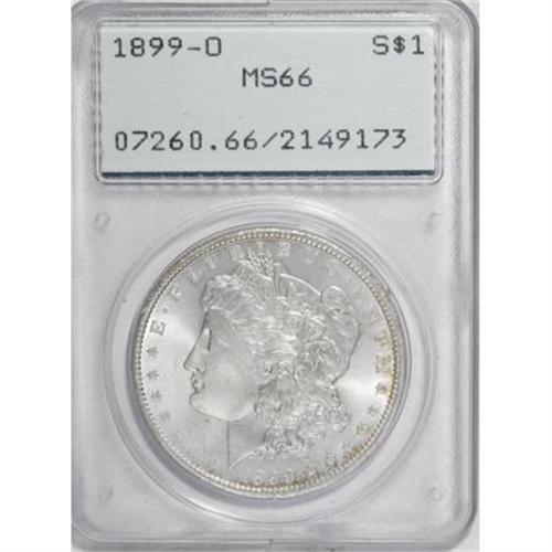 <B>1899-O $1 MS66 PCGS.</B></I> . PCGS Population (1014/79). NGC Census: (870/78). Mintage: 12,290,000. Numismedia Wsl. Price for NGC/PCGS coin in MS66: $360. (#7260)<BR><BR><B>Coin Engraver:</B> George T. Morgan<BR><BR><b>Shipping:</b> Coins & Currency (<a target="_blank" href="http://www.heritageauctions.com/common/shipping.php">view shipping information</a>)