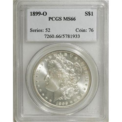 <B>1899-O $1 MS66 PCGS.</B></I> PCGS Population (1019/79). NGC Census: (872/78). Mintage: 12,290,000. Numismedia Wsl. Price for NGC/PCGS coin in MS66: $360. (#7260)<BR><BR><B>Coin Engraver:</B> George T. Morgan<BR><BR><b>Shipping:</b> Coins & Currency (<a target="_blank" href="http://www.heritageauctions.com/common/shipping.php">view shipping information</a>)