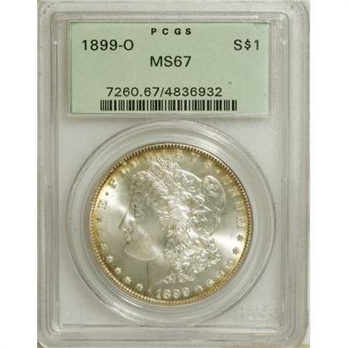 <B>1899-O $1 MS67 PCGS.</B></I> Whispers of canary-yellow and gold-orange patina visit the margins, while the shining centers are bright silver-white. A boldly impressed and delightful Superb Gem example of this popular O-mint issue. PCGS has graded only one finer example (1/08).<BR><BR><B>Coin Engraver:</B> George T. Morgan<BR><BR><b>Shipping:</b> Coins & Currency (<a target="_blank" href="http://www.heritageauctions.com/common/shipping.php">view shipping information</a>)