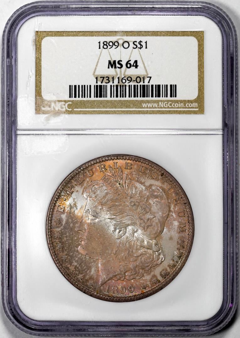 One 1899-O $1 Morgan Silver Dollar Coin NGC MS64 Amazing Toning. NGC Certified.