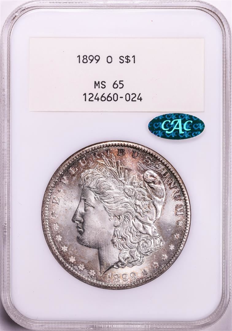 One 1899-O $1 Morgan Silver Dollar Coin NGC MS65 CAC Old Gen 2.1 Fatty Holder. NGC Certified.