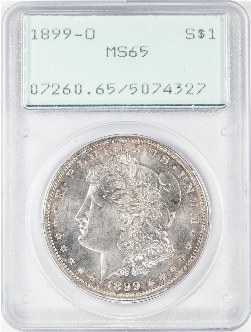 One 1899-O $1 Morgan Silver Dollar Coin PCGS MS65 Old Green Rattler. PCGS Graded.