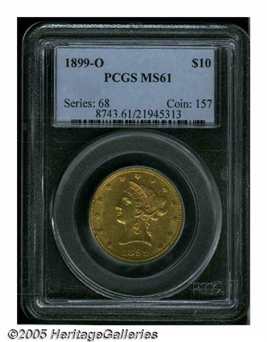 <B>1899-O<$10> MS61 PCGS.</B></I> This O-Mint is well struck, though the hair over Liberty's ear is soft. Honey-gold surfaces display nice luster, and show several light abrasions scattered about, especially on the obverse. A difficult issue in Mint State. Indeed, at the MS61 level, only ten coins have appeared for sale through the major auction houses over the last fifteen years, and 13 finer. Population: 51 in 61, 21 finer (5/05).
