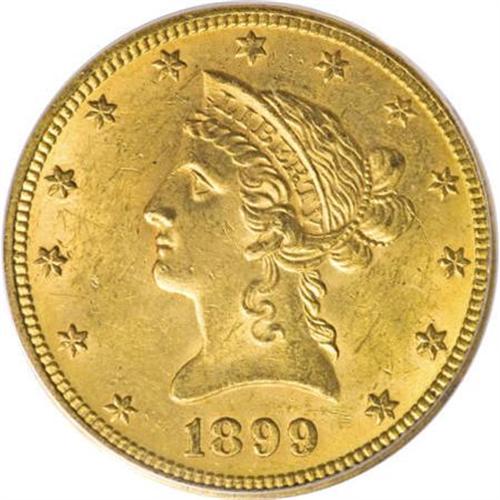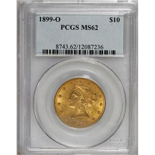 <B>1899-O $10 MS62 PCGS.</B></I> A mintage of 37,047 pieces ensures the scarcity of the 1899-O in all grades. Most survivors are AU55 to MS61, which suggests indifferent storage in Treasury or bank vaults. This well struck example has relatively few marks, and luster is substantial, especially on the reverse. Population: 16 in 62, 11 finer (8/07).<BR><BR><B>Coin Engraver:</B> Christian Gobrecht<BR><BR><b>Shipping:</b> Coins & Currency (<a target="_blank" href="http://www.heritageauctions.com/common/shipping.php">view shipping information</a>)