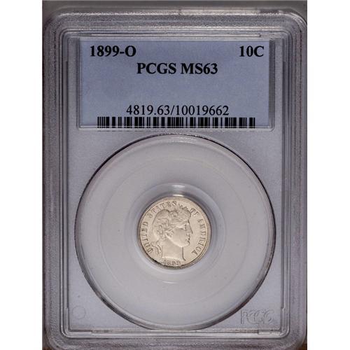 <B>1899-O<10C> MS63 PCGS.</B></I> Softly struck on the lower left wreath details, but otherwise boldly impressed and satiny, with light creamy color over both sides. The nicely preserved surfaces reveal a few wispy slide marks on Liberty's cheek, but no serious blemishes. A scarce date in Uncirculated grades. Population: 10 in 63, 17 finer (4/06).