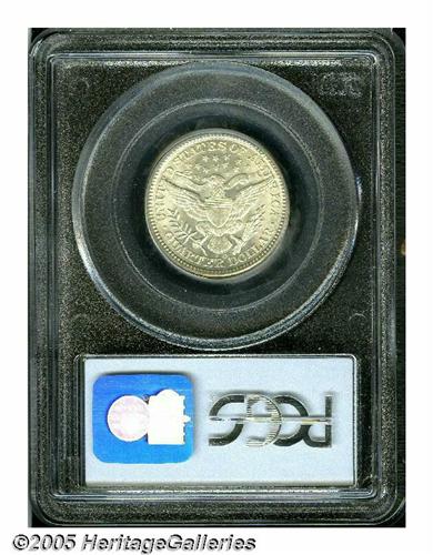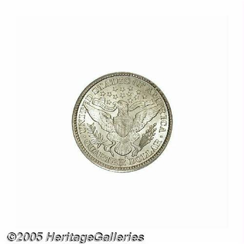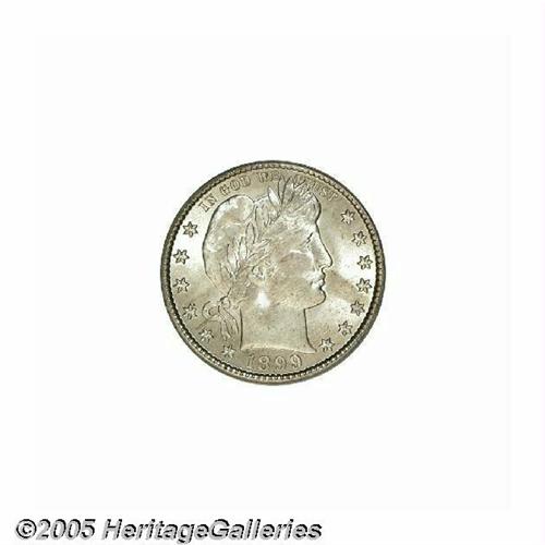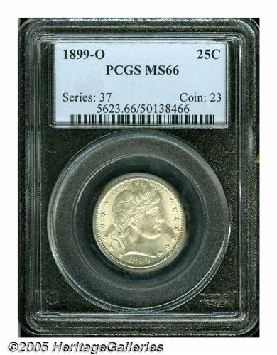 <B>1899-O<25C> MS66 PCGS.</B></I> Blazing luster emanates from nearly white surfaces that exhibit just a few speckles of light gold in select areas of the obverse. The design elements are sharply struck, except for softness in the upper right (facing) corner of the shield. A few minute marks on Liberty's cheek and on the shield are mentioned for accuracy. PCGS and NGC combined show a population of six coins at the 66 level, and a mere two finer (6/05).
