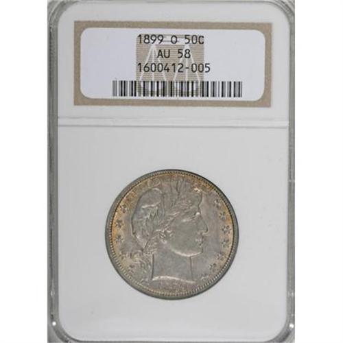<B>1899-O 50C AU58 NGC.</B></I> NGC Census: (7/45). PCGS Population (8/74). Mintage: 1,724,000. Numismedia Wsl. Price for NGC/PCGS coin in AU58: $425. (#6484)<BR><BR><B>Coin Engraver:</B> Charles E. Barber<BR><BR><b>Shipping:</b> Coins & Currency (<a target="_blank" href="http://www.heritageauctions.com/common/shipping.php">view shipping information</a>)