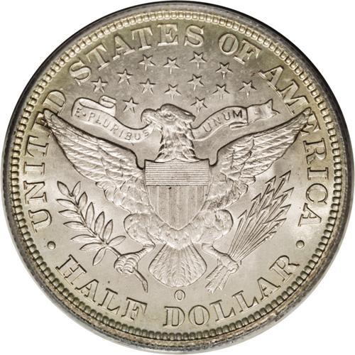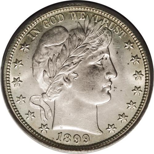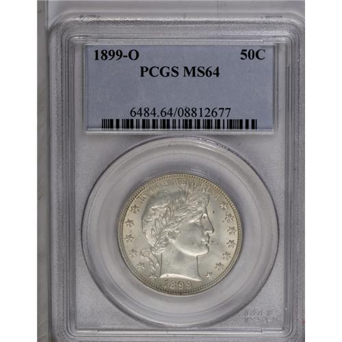 <B>1899-O<50C> MS64 PCGS.</B></I> The 1899-O is a better date among O-mint Barber halves. The number of high grade examples is certainly small--PCGS has only certified 22 pieces in MS64 with 11 finer (8/06). This piece shows superior striking details when compared to most New Orleans halves. The surfaces are satiny and each side shows even gray-golden toning.