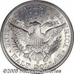 <B>1899-O 50C MS66 NGC.</B></I> A better New Orleans issue, and always popular as the final year from the 19th century. The obverse is fully defined, but curiously, the reverse shows a noticeable lack of detail on the eagle's head, neck, right wing, and claw. Brilliant throughout with bright satiny mint luster and no reportable abrasions or mint-made defects. Population: 7 in 66, 1 finer (2/05).<BR><I>From The Richard J. Chouinard Collection of United States Coins, Part Three.</B></I>