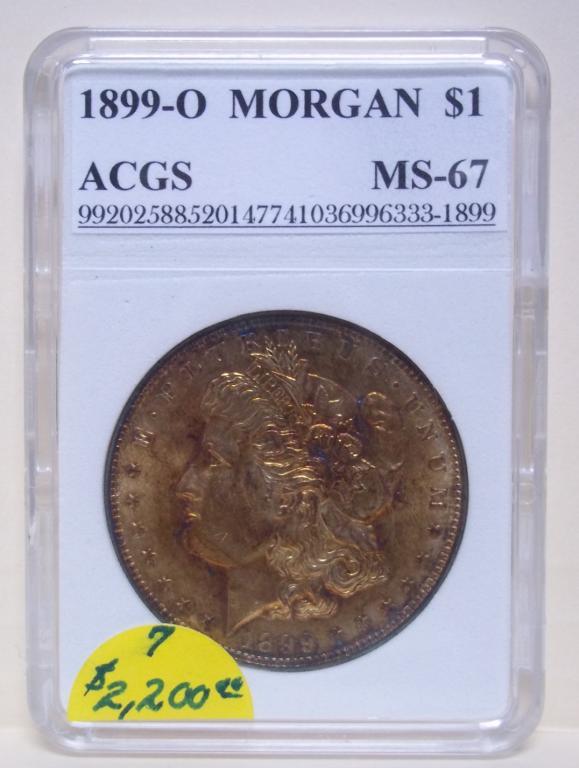 ACGS certified, and graded Mint State-67! A fantastic coin with a fully toned obverse, featuring shades of pale gold and hints of crimson and teal. An excellent strike, with tremendous detail in the devices of both obverse and reverse. This is a breath taking coin, and will inspire any and envy in all who see it!