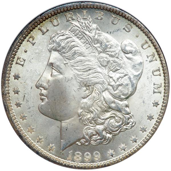 1899-O Morgan Dollar. NGC graded MS-65. Mostly white with a splash of golden tone about the borders (PCGS # 7260) .