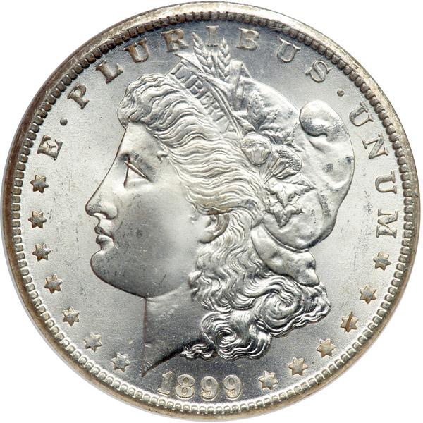 1899-O Morgan Dollar. NGC graded MS-67. A blast white gem, superb from top to bottom, side to side, and it is from side to side that the luster dances across the surface as one views and tilts the coin inspecting its supreme beauty. Boldly struck, as well. Pop 94; none finer (PCGS # 7260) .