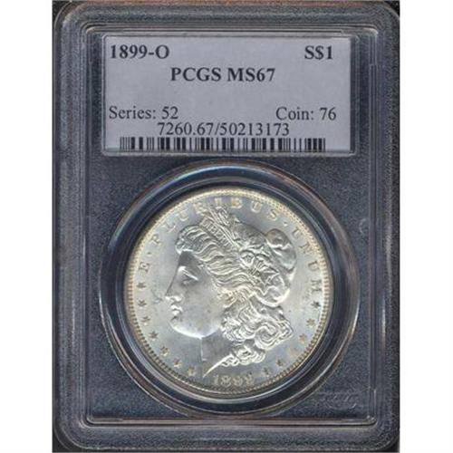 <b>1899-O Morgan Dollar. PCGS graded MS67.</b> Superb! Fully original with shivering cold silvery radiance like the full white moon on a clear winter's night. If one were to take a poll of grading services, we'd see that the strike is nonstandard for the issue in being sharp with the excellent metal flows on both sides into the deepest die recesses; in other words, a very bold strike <b>(PCGS # 7260)</b>