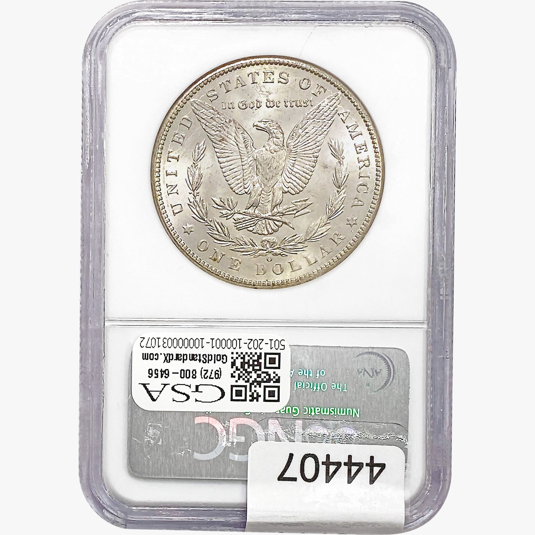 e. Coins sold referencing a third-party grading service are sold “AS IS” without any express or implied warranty, except for a guarantee by GSA that they are genuine. Removal or alteration of the holder, voids all of Bidder’s claims concerning that Product. Certain warranties may be available from the grading services and Bidders are referred to them for further details: Numismatic Guaranty Corporation (NGC), PO Box 4776, Sarasota, FL 34230, www.ngccoin.com/services/writtenguarantee.asp; Professional Coin Grading Services (PCGS), PO Box 9458, Newport Beach, CA 92658, www.pcgs.com/guarantee.html; ANACS, 6555 S. Kenton St., Ste. 303, Englewood, CO 80111; and Independent Coin Grading Co. (ICG), 7901 East Bellview, Ave., Suite 50, Englewood, CO 80111.