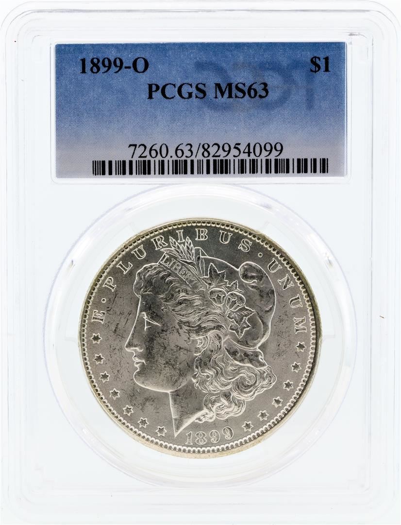 One 1899-O PCGS MS63 Morgan Silver Dollar.