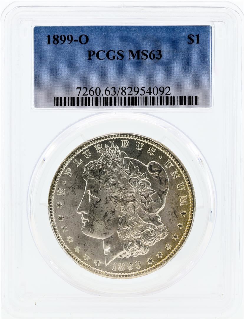 One 1899-O PCGS MS63 Morgan Silver Dollar.