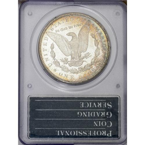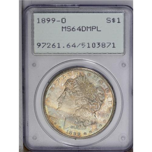 <B>1899-O<img border='0' src='http://www.heritagecoins.com/images/star.gif' width=10 height=10>$1> MS64 Deep Mirror Prooflike PCGS.</B></I> The obverse is toned in waves of green and golden-orange, while similar colors affect only the peripheral areas of the reverse. Choice and better DMPL examples of this New Orleans issue are not often encountered. Population: 66 in 64, 60 finer (3/06). <BR><BR><B>Important notice:</B> Heritage usually auctions material at the rate of 200-250 lots per hour. On some occasions eBay Live bid software or the Internet may not be able to keep up with the pace of the auction. We recommend placing a realistic absentee bid now as insurance to avoid disappointment. Occasionally the auctioneer may eliminate or reject an eBay Live bid, and the auctioneer may also reopen a lot after the close of the eBay live bidding (usually because we missed an audience bid), and may reject your bid even if it shows you as the winning bidder. By bidding via eBay Live, you agree that Heritage may award the lot to another bidder at its sole discretion under the circumstances described above or any other reasonable circumstances. Since eBay bids are not shown to us until we open the lot on the floor, we treat those bids just like floor bids. In most cases the floor responds before the eBay bid is presented to us, due to Internet lag time, so for consistency we have made it a policy that floor bids are always considered first over tie eBay live bids. Also please note that all Heritage lots purchased through eBay Live carry a 20% Buyer's Premium. Please make sure you read the Terms and Conditions before you bid. This lot is being auctioned in conjunction with a live floor auction by Heritage Galleries & Auctioneers. All final auction and invoice information will be supplied by Heritage Galleries & Auctioneers, and all other information should be considered preliminary. Lot:3735 <BR><BR><B>Winning Notification and Billing:</B> After the FINAL session in this auction is complete, Heritage will send e-mail and snail mail invoices. This process normally takes several days. All final auction and invoice information will be supplied by Heritage Galleries & Auctioneers, and all other information should be considered preliminary. <BR><BR>This auction will be conducted on a live auction floor and over the Internet through eBay Live. If you choose to place an absentee bid, please take a moment to <font color='#0000ff'><u><a href='http://pages.ebay.com/liveauctions/help/before/laabsentee.html'>learn how eBay Live absentee bidding works</a></u></font><font color='#000000'>