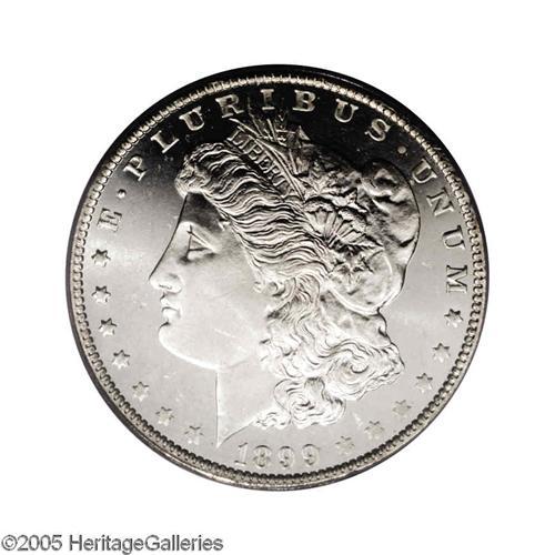 <B>1899-O<S$1> MS66 Deep Mirror Prooflike PCGS.</B></I> Fully struck, except on the lower wreath details, just above the mintmark, and brilliant throughout. The fields are deeply reflective, with a light accent of mint frost over the devices, yielding an admirable and visually captivating degree of cameo contrast on both sides of the piece. A relatively high mintage New Orleans issue, and readily available in the MS66 grade level, but only without Prooflike or Deep Mirror Prooflike characteristics. As a Deep Mirror Prooflike premium Gem, this coin is very scarce and highly desirable, especially to anyone pursuing a high grade collection of DMPL Morgan Dollars. Population: 17 in MS66 Deep Mirror Prooflike, 2 finer (11/05).