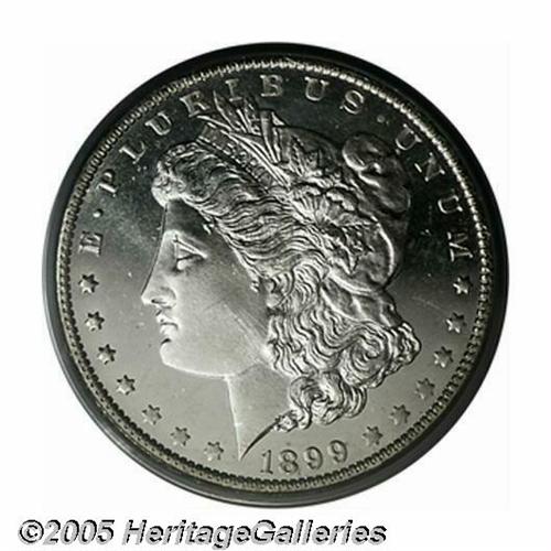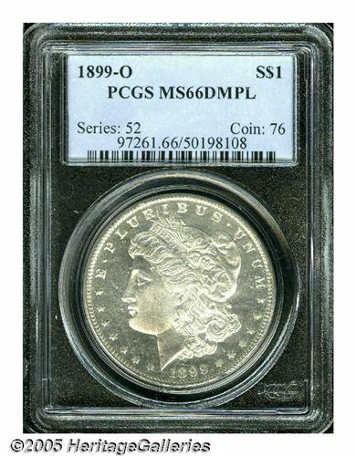 <B>1899-O<S$1> MS66 Deep Mirror Prooflike PCGS.</B></I> Fully struck, except on the lower wreath details, just above the mintmark, and brilliant throughout. The fields are deeply reflective, with a light accent of mint frost over the devices, yielding an admirable and visually captivating degree of cameo contrast on both sides of the piece. A relatively high mintage New Orleans issue, and readily available in the MS66 grade level, but only without Prooflike or Deep Mirror Prooflike characteristics. As a Deep Mirror Prooflike premium Gem, this coin is very scarce and highly desirable, especially to anyone pursuing a high grade collection of DMPL Morgan Dollars. Population: 17 in MS66 Deep Mirror Prooflike, 2 finer (4/05).
