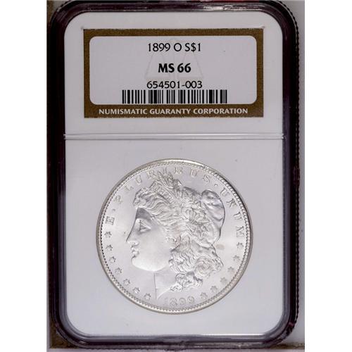 <B>1899-O<img border='0' src='http://www.heritagecoins.com/images/star.gif' width=10 height=10>$1> MS66 NGC.</B></I> A remarkable Premium Gem with pristine silver surfaces and fully brilliant, frosty luster. Like many of the Morgan dollars in the present offering, this example provides a wonderful combination of grade and price. <BR><BR><B>Important notice:</B> Heritage usually auctions material at the rate of 200-250 lots per hour. On some occasions eBay Live bid software or the Internet may not be able to keep up with the pace of the auction. We recommend placing a realistic absentee bid now as insurance to avoid disappointment. Occasionally the auctioneer may eliminate or reject an eBay Live bid, and the auctioneer may also reopen a lot after the close of the eBay live bidding (usually because we missed an audience bid), and may reject your bid even if it shows you as the winning bidder. By bidding via eBay Live, you agree that Heritage may award the lot to another bidder at its sole discretion under the circumstances described above or any other reasonable circumstances. Since eBay bids are not shown to us until we open the lot on the floor, we treat those bids just like floor bids. In most cases the floor responds before the eBay bid is presented to us, due to Internet lag time, so for consistency we have made it a policy that floor bids are always considered first over tie eBay live bids. Also please note that all Heritage lots purchased through eBay Live carry a 20% Buyer's Premium. Please make sure you read the Terms and Conditions before you bid. This lot is being auctioned in conjunction with a live floor auction by Heritage Galleries & Auctioneers. All final auction and invoice information will be supplied by Heritage Galleries & Auctioneers, and all other information should be considered preliminary. Lot:3733 <BR><BR><B>Winning Notification and Billing:</B> After the FINAL session in this auction is complete, Heritage will send e-mail and snail mail invoices. This process normally takes several days. All final auction and invoice information will be supplied by Heritage Galleries & Auctioneers, and all other information should be considered preliminary. <BR><BR>This auction will be conducted on a live auction floor and over the Internet through eBay Live. If you choose to place an absentee bid, please take a moment to <font color='#0000ff'><u><a href='http://pages.ebay.com/liveauctions/help/before/laabsentee.html'>learn how eBay Live absentee bidding works</a></u></font><font color='#000000'>